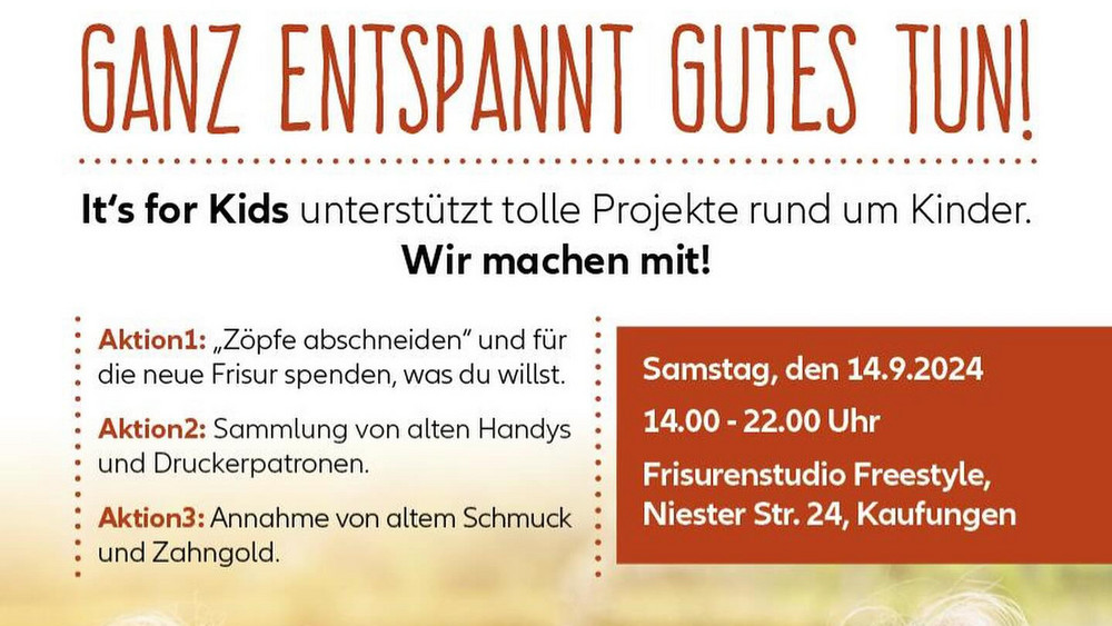 Schnipp, Schnapp, Haare ab – um Kindern zu helfen. Am Samstag könnt ihr eure langen Haare abschneiden lassen und spenden. Freddy ist Friseurmeister und hatte mit der Organisation „It’s for Kids“ die Idee. Für das neue Styling muss nichts bezahlt werden. An dem Tag heißt es: einfach im Haarstudio Freestyle vorbeikommen. Das geht auch ohne lange Haare, ihr könnt zum Beispiel Geld spenden und so helfen.