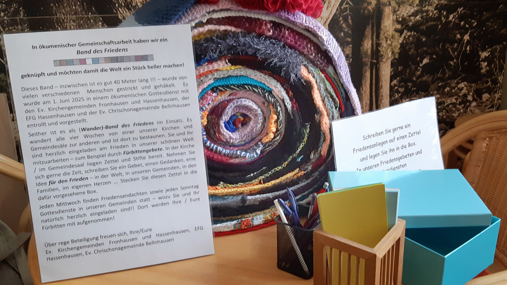 Ein Friedensband aus Wolle, gestrickt oder gehäkelt, hängt aktuell in der evangelischen Kirche in Hassenhausen. Mittlerweile ist es schon 40 Meter lang. Jede und jeder ist herzlich eingeladen, weitere Teile an das Band anzuhängen. Dazu gibt es eine Box für Gebetsanliegen.