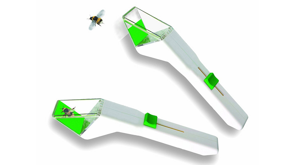 "Snapy" ist eigentlich nichts anderes als die Hightech-Version der klassischen "Glas drüber, Papier drunter schieben"-Fangtechnik. Vorne befindet sich eine durchsichtige Kammer, die über das Insekt gestülpt wird. Über einen Schieber am Griff lässt sich die Kammer dann mit einem dünnen Verschluss schließen. Das Insekt ist gefangen und kann unversehrt draußen wieder ausgesetzt werden.