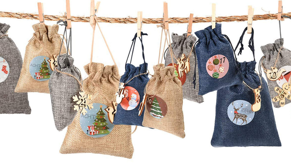 Dieser Adventskalender besteht aus 24 Stoffbeuteln, die am Ende mit hölzernen Wäscheklammern an einer Leine befestigt werden. Die Säckchen haben unterschiedliche Größen und können mit weihnachtlichen Aufklebern oder Holzanhängern dekoriert werden.